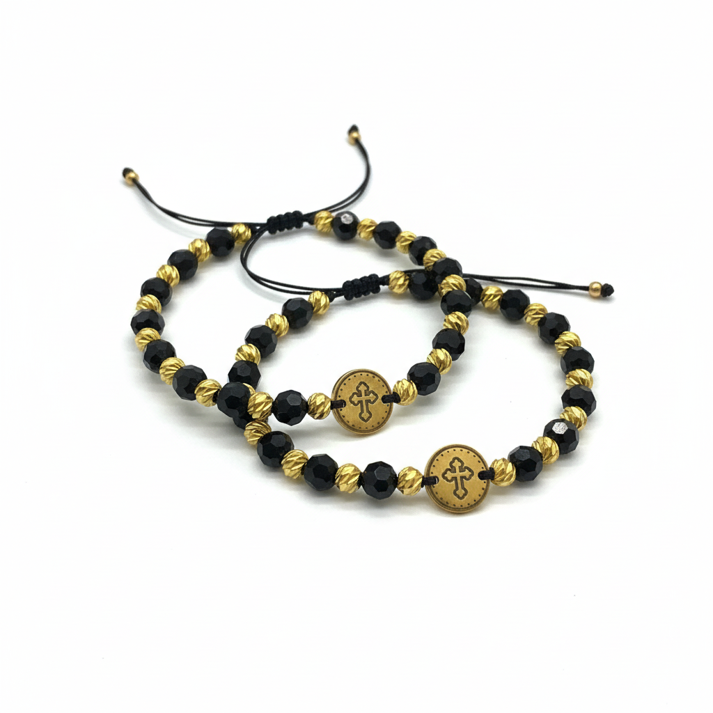 Set de 2 brățări reglabile, cu elemente placate cu aur, binecuvântate de călugări și purtate ca scut împotriva răului pentru mamă și fiu, soț și soție sau doi oameni uniți prin credință.