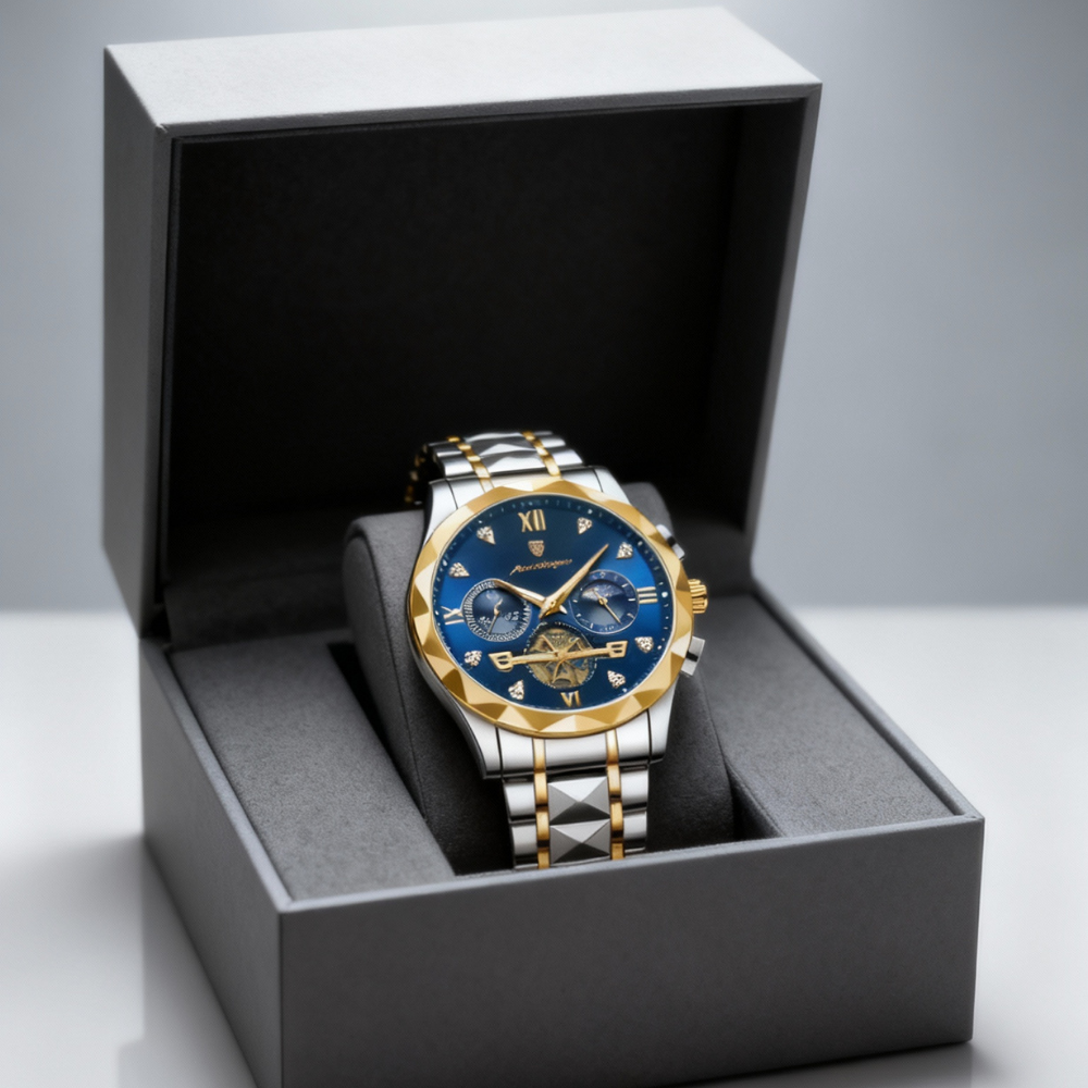 ✅ Cadran albastru cu subcadrane decorative și detalii aurii – aspect tehnic, modern