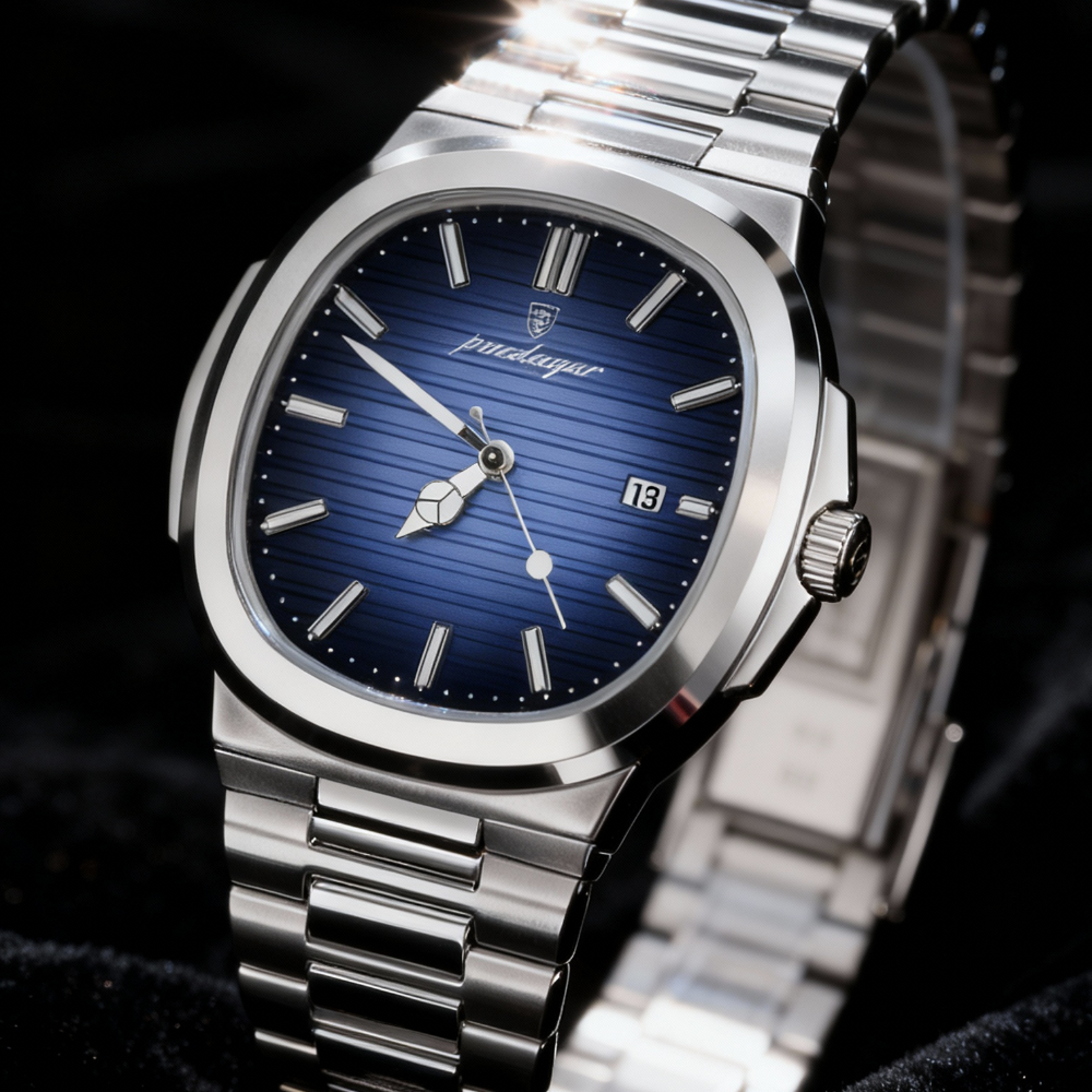 Brățara metalică plină, finisată uniform, și cadranul albastru cu linii discrete creează o combinație care merge la fel de bine la cămașă și sacou, cât și la o ținută casual cu jeans și tricou. Este ceasul pe care îl poți purta zilnic fără să pară „prea mult”.