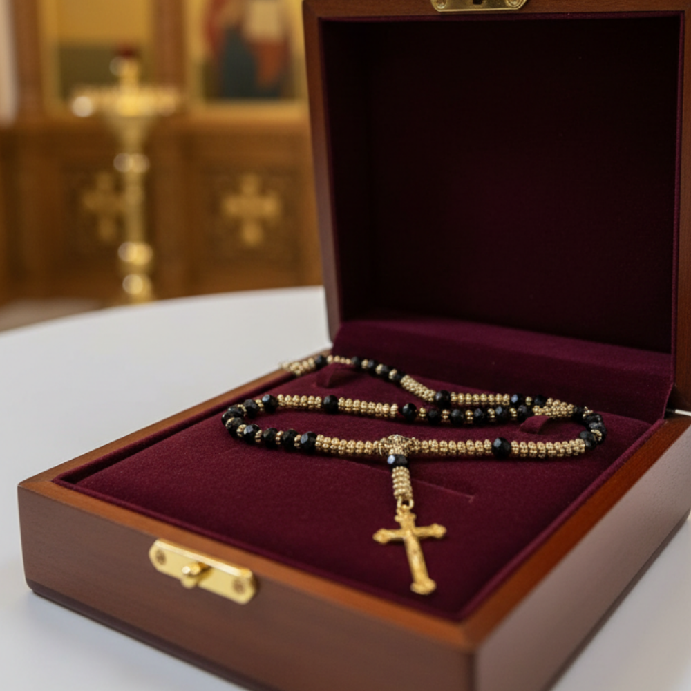 După ce este terminat, colierul este așezat la icoane și sfințit, astfel încât harul primit acolo să te însoțească oriunde mergi. Crucea placată cu aur de 18K îți amintește, la fiecare atingere, că nu ești singur – Dumnezeu merge cu tine.