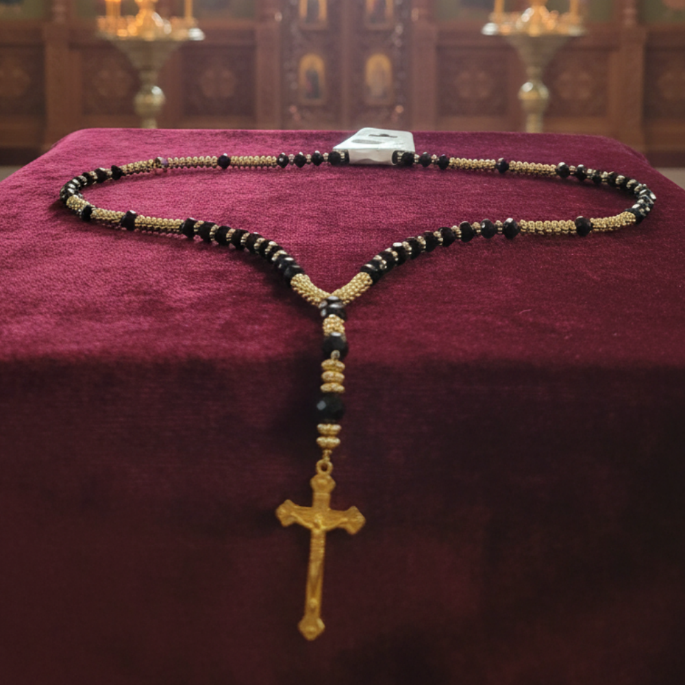 Lucrat manual de călugării de la Athos, din mărgele negre fațetate și mărgele aurii placate cu aur de 18K, cu cruce placată cu aur de 18K care nu oxidează, acest colier este gândit să fie purtat zi de zi, la gât, aproape de inimă. Se așază elegant la nivelul pieptului, nu este greu, nu zgârie și nu deranjează.